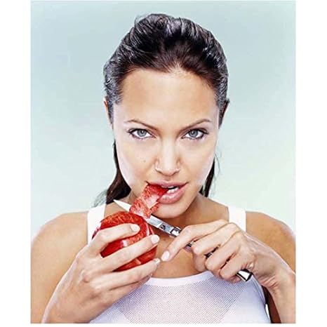 Angelina Jolie Holding Knife And Apple Skin In Mouth Looking Forward